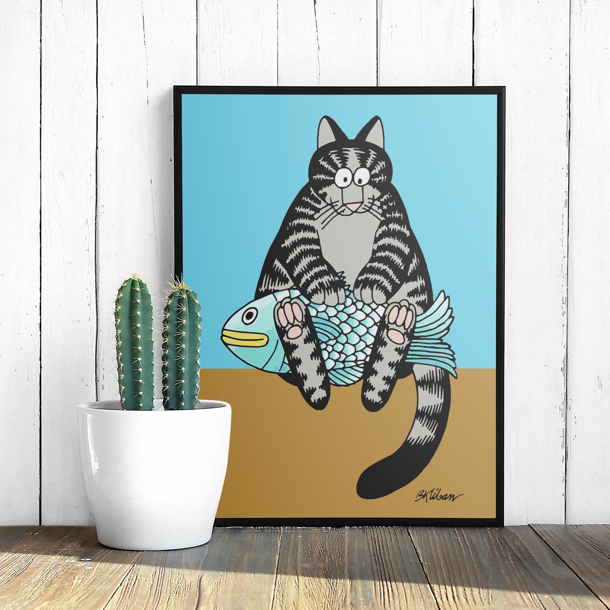 Add a dash of feline fun to your space with this delightful artwork of a cat and fish by Bernard Kliban from the 70s. Printed on high-quality premium matte paper, this piece brings a retro touch to any wall it adorns.